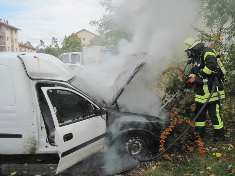 Bei Eintreffen der Feuerwehr wurde ein Kleinbus in Vollbrand angetroffen. Das Feuer wurde durch zwei Trupps unter PA abgelöscht. Im Laderaum gelagerte Gasflaschen wurden rechtzeitig entfernt.